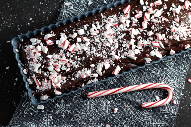 Place over medium-low heat and stir until melted and smooth. Spread evenly in the prepared pan and sprinkle with crushed candy canes.